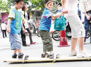 读者龙巍:16日下午,延安路上一家商场门口举行了旱地龙舟赛,这两个很要好的小男孩跟着大人一起参加比赛。