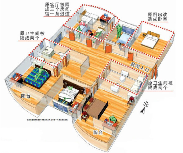 他说,和楼上的租户交涉过多次,每次去敲门,都是不同的人开门。他看到,这套实际面积120平方米的房子,总共开了12道门,8个单间和4个卫生间。
