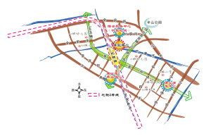 桃源区块内目前还没有像样的路。今后将以桃源街为主要生活轴,周围布置居住小区以及商业金融用地。云锦路,和桃源街“十”字交叉,打造成绿化景观轴。