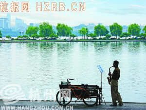 读者老摄:伴随着柔柔的夏日微风,西湖的早晨开始了,这湖边吹萨克斯的人恰好给西湖制造了曼妙的背景音乐,这就是西湖晨曲吧。