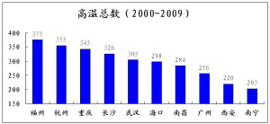 前两天,中央电视台气象主持人宋英杰在博客上,发布了一个近10年来(2000—2009年),中国各大城市的累积高温日数的排行榜前十名。