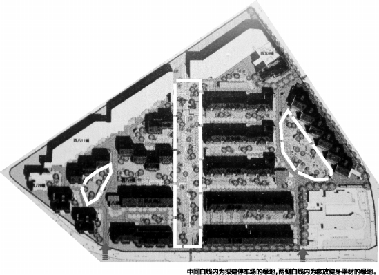 中间白线内为拟建停车场的绿地,两侧白线内为移放健身器材的绿地。