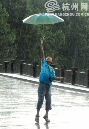昨日雨中,一个小男孩在白堤上玩起了雨伞。 胡聪 摄