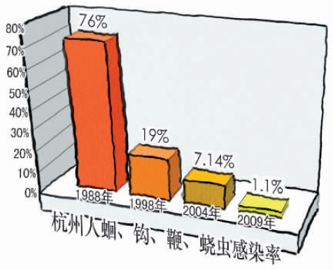 调查的结果令人欣慰:总感染率只有1.12%,其中感染蛔虫的人数占比为0.25%,钩虫0.65%,鞭虫0.12%,蛲虫0.1%。以2009年末杭州常住人口810万人计算,只有9万人肚子里还有虫,其中有蛔虫的仅2万人。