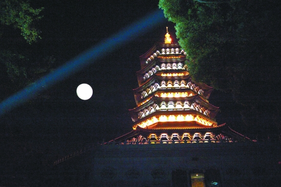 昨晚,雷峰塔景区明月大如圆盘。