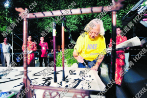 王冬龄和吴山明,是我市书法界和国画界的两位领军人物,他们虽然都生活在杭州,但彼此谋面的机会并不多。前晚,他们像久别重逢的老友,坐在一起低声细语,嘴角时不时流露出一个惬意的微笑。茶过三巡,话过五荐,他俩被主持人请上台,为花好月圆挥毫泼墨助助雅兴。本以为这是一次书法和国画的激情碰撞,没想到吴山明雅兴正浓,居然写起了书法,其“但愿人长久,千里共婵娟”10个大字一蹴而就,别有一番雅韵,字里行间流露出对生活的美好祝愿。而王冬龄的“湖月明”三个大字,下笔力道精准,线条就像人体肌肉皮肤一样,显示出了美丽的轮廓,用酣畅的浓墨演绎出了书法技艺的美妙。