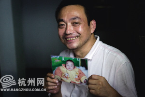 郭先生捧出一本长方形红相册,爬上床,蹲着,翻开相册,一张张照片指给我们看:洋洋刚出生时的样子、100天纪念、母亲给儿子换尿布照、洋洋打喷嚏……有一张照片上特地注明:祝浩洋健康活泼快乐成长。