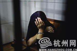当有人凑近,她赶紧举起戴着手铐的手,挡住脸。