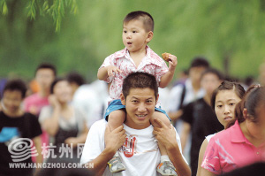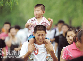 昨日,一位家长驮着正在吃月饼的小朋友游览西湖。传统的中秋佳节,杭州市气温明显下降,4-5级的偏北风一扫前几日30℃以上的高温,许多市民借中秋假期来到西湖景区观赏游览,欣赏西湖风景。新华社发