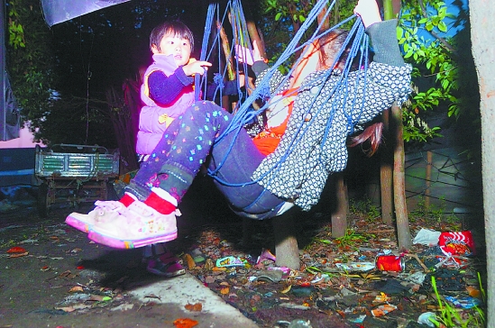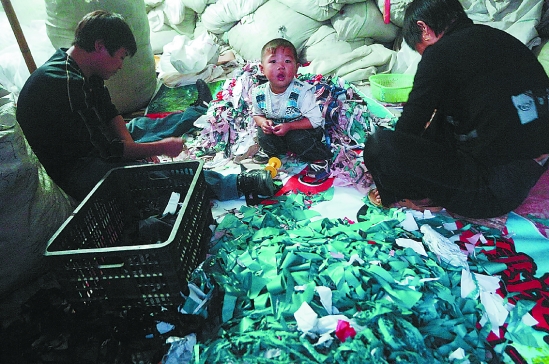 姚如安与妻子在“家”分拣碎布,儿子在玩耍。