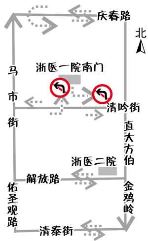 马市街庆春路路口——马市街解放路路口、佑圣观路解放路路口——佑圣观路清泰街路口机动车实行由南向北单向通行。