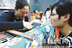 我今天带着七八个学生来,他们所学的专业是工艺美术,比如剪纸、刺绣、陶艺等等。工艺美术作为十大特色潜力行业在这里展览,所以我们特地赶来看。杭州有非常深厚的工艺美术底蕴,官窑瓷器、扇子、杭绣等,这些都是杭州的宝贵财富。可惜相比其他行业,工艺美术行业协会的展厅没有表演,没有一些互动节目,显得有点冷清,让我挺遗憾的。于是学生们自发当起了宣传员,向大家介绍一幅王文瑛大师的双面绣作品,正面是今天的雷峰塔,反面是民国时期的雷峰塔,整整花了两年时间才绣完,这么精美的工艺,看过的人没有不赞叹的。所以我觉得这个展览是一个很好的平台,让更多的人看到工艺美术的风雅,更了解精美的作品背后,大师们付出的心血。