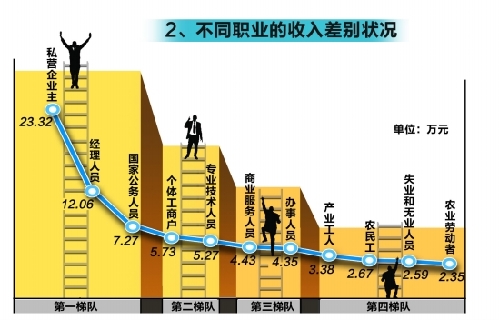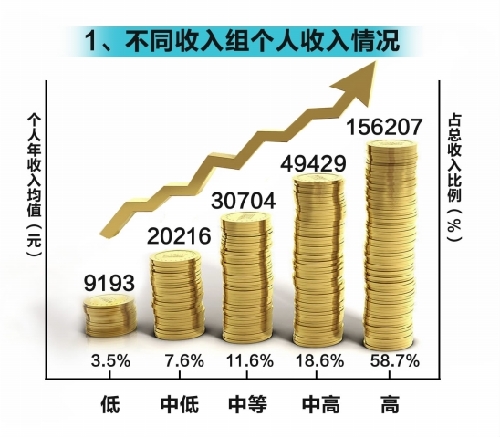 报告中的关键数字令人深思:20%高收入组的个人年收入均值是20%低收入组的17倍;20%低收入组占有的收入仅占总收入的3.5%,而20%高收入组占有的收入达到了总收入的58.7%,七成以上调查者收入在平均线以下,贫富两极分化的趋势渐明显。