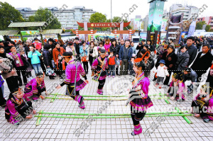 姑娘们正在表演来自章村的畲族竹竿舞。
