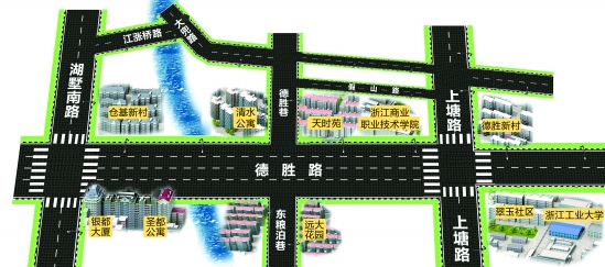 现状:这里北侧主要集中了清水公寓、天时苑等多个小区,以及浙江省商业职业技术学院(德胜校区)等单位,南侧主要是远大花园等小区。