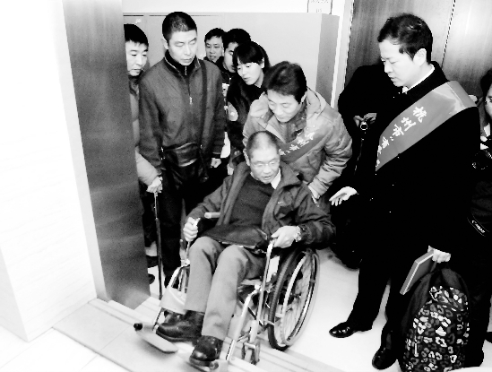 在市民中心地下一层的厕所,厕所门口的数层台阶,就像一个高高的“门槛”。肢残人士孔先生坐在轮椅车上使劲往上推,却无论如何越不过“槛”。一名壮实的爱心使者上前帮忙,无奈台阶比较高,轮椅车只得放弃。