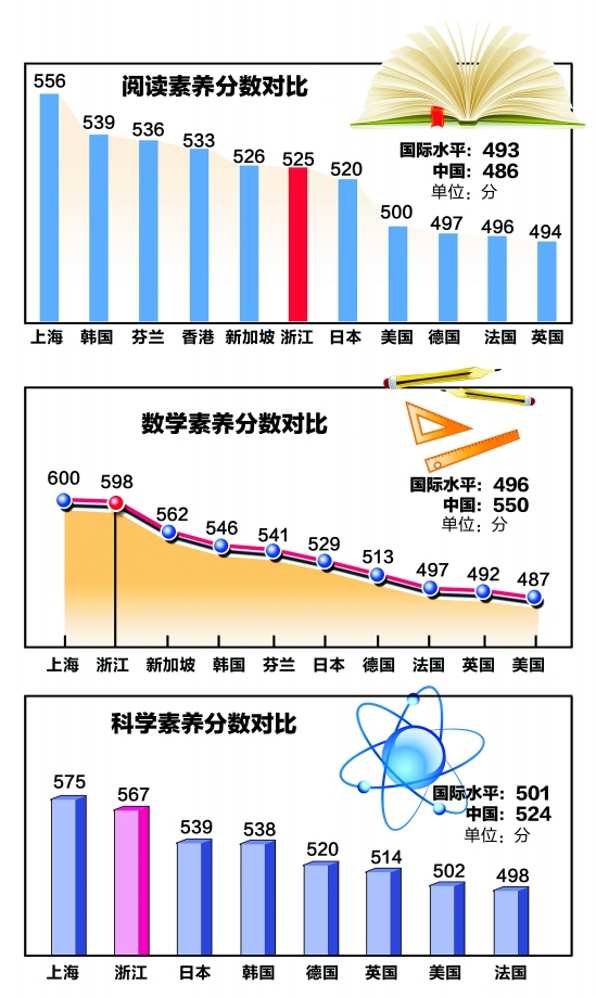 全球公认的一个权威指标就是这个学生能力国际评价(PISA)。在最近PISA2009测试中,第一次参与测试的上海学生在阅读、数学和科学素养三方面夺得第一,震惊世界。事实上,2009年,中国大陆还有11个省市作为试测地区,其中就包括浙江、北京、天津、江苏等。中国试测的研究工作由教育部考试中心统筹,从11个省市抽取了621所学校、21003名学生作为样本,浙江地区1800余名15岁学生的试测工作由省教育考试院组织实施。昨晚,浙江首次公布试测成绩,浙江学生在阅读、数学和科学成绩均处于全国试点地区(除上海以外)的第一位。数学和科学素养全球第二,阅读素养全球第六。
