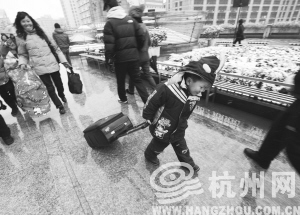 裹着一条被子,手里抱着热水袋,坐在小凳子上的李燕来自湖南岳阳,在杭州经营一家小饭店。她说,她从早上10点钟就来排队了,1月28日之前的火车票都没有了,所以她决定晚上就在这里过夜,明天看看能否买到1月29日的票。在她的身边,放着一盒方便面和一个热水瓶。“只要能回家,不吃也要坚持。”李燕说,就像是在做一件为理想而拼搏的大事情。