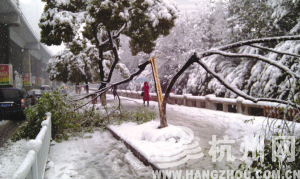 杭高附近,一棵树被雪从中间劈开。 摄影 江武