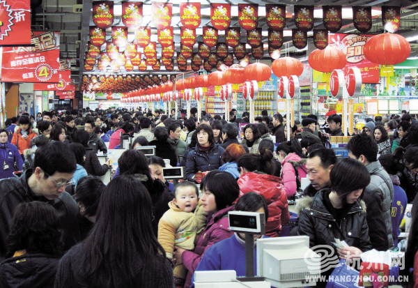 昨天下午,许多市民涌入庆春路上的世纪联华购买年货,即使超市把所有的结算通道打开,顾客也还是要排着长队等候结账付钱。随着春节进入倒计时,杭城交通返乡高峰之后再现年货购买高峰,除了火车站附近的道路拥堵外,杭城各大超市附近也开始车水马龙。记者 詹逾 摄