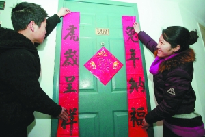 1月29日,在杭州工作的安徽人杨思俊和牛岩岩,正忙着为他们的新家贴春联。作为“夹心层”群体,这对“80后”夫妇今年以每月530元的价格申请到了三塘高层公寓一套面积约41平方米的公共租赁房,两人准备赶在春节前入住。本报记者 吴煌 摄