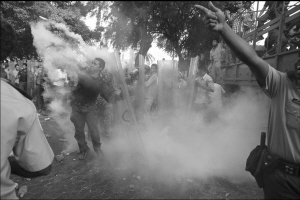 2月7日,马尔代夫首都马累,警察与军队冲突时遭催泪弹袭击。