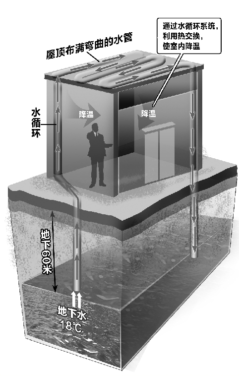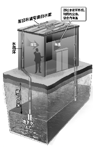 建筑内部的空调也挺值得一提。这里的空调跟咱们家里用的空调有点不大一样——它不用电。啥原理?如果你看到屋顶那些弯弯曲曲的水管,说不定你就会明白几分了。这是一套地源热泵系统,设计之初,建筑外围就有管道深入到地下60米处,取出18℃左右的水,形成一个水循环系统,用冷热交换的办法,使室内降温。