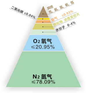 混合气体里最多的是氮气,占一口空气总体积的78.09%不到一点。其次是氧气,占一口空气体积的20.95%不到一点。第三位的是氩气,占空气体积的1%不到一点。还有二氧化碳,占空气总体积的0.04%左右;另外还有极少量的氖、氦、氢、氡、氙气等。