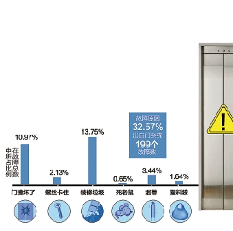造成电梯故障的原因里,脆弱的电梯门再次成了症结所在,足足占了1/3(见图)。其中最离奇的是有21起事件都是由于烟蒂引起的。小小烟蒂为何有如此威力?维修人员告诉记者,电梯门缝里一旦卡有异物,即使门关上了,电源触点也连接不上,电梯就会停住,这是电梯安全运行的一种自我保护。