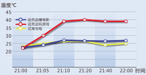 实验继续。在接下来的半个小时内,正常充电和播放电影的手机温度都没有超过27℃,边玩边充的手机温度也依然维持在39℃左右。