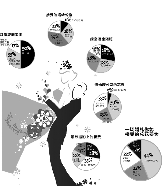 在婚礼上穿一套完美的婚纱,是每个女人的愿望。调查显示,有一半的女性愿意在婚礼上“租一件婚纱,”因为“反正只穿一次”;剩下一半的女性认为婚纱还是要自己买新的,毕竟这婚一辈子只结一次。其中,在对婚纱的要求上,33%的女人认为“对品牌无所谓,但是款式要好,价格要实惠。”还有17%的女人则比较看重婚纱的品牌,并希望能“量身定制”,价格高点无妨。