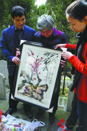 昨天记者陪烈士家属去扫墓 征集来的慰问礼物交到家属手中:一幅画、一束叶脉花和一盆石景,各有寓意