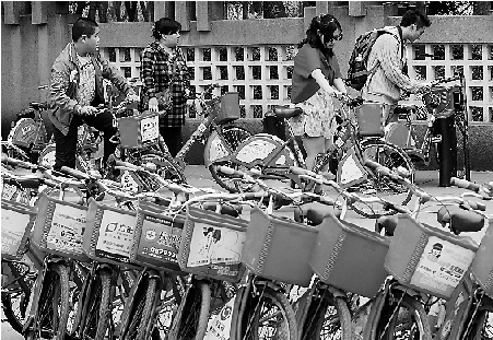 为避免堵车,租公共自行车成为很多游客最好的选择。 林云龙 摄