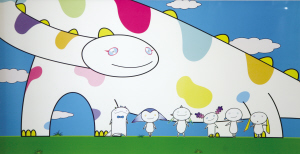 这是村上隆的惯用手法。他曾在一次讲座中说:高度专业的画家已不被需要了,未来艺术家的重点是怎么和社会契合——在他眼中,什么都是生意,艺术创作也不例外。他将米老鼠的变体形象植入自己的作品Mr.DOB,将它视为自己的化身并成为独特的视觉符号。在他的这些产品或作品中,包括有卡通绘画、半精简式的雕刻、巨大的充气气球、表演剧场、手表、T恤等,所有的产品或作品上,都会有Mr. DOB的纹样,作为他本人独特的签名分身,成为深受年轻人喜爱的潮流品。