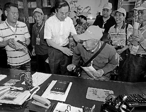桐庐县委书记毛溪浩邀请江南镇市民代表汪阿水坐在自己办公椅上,体验自己平时的工作。 本报记者 林云龙 摄