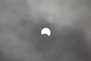6:18,最精彩的食甚阶段到来,太阳越升越高,肉眼已经无法直接观看了。我拿出巴德膜,挡在镜头前,可以清晰地看到太阳变成了一轮“月牙儿”。随后,黑影慢慢向左下方移动,日食进入到复圆阶段。
