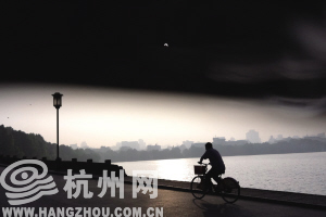 西湖边,直到5:40,太阳才从云层里钻出来,太阳的右上角已经有了缺口。