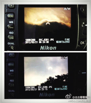 从“走走看看摄影”的微博里,可以看见不少好照片,这张日食照片,是他用摩托罗拉智能手机翻拍尼康相机的。昨天13:03,“走走看看摄影”在浦东机场登上了汉莎航空747,要12个小时才能到达德国,所以没能和他取得联系。