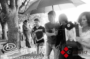 车子开到岳庙码头,妻子丽珍和女儿捧着吴斌的遗像慢慢地朝西湖边走去。