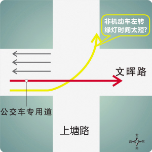 这个路口由西向东自行车道上,当电动车、自行车由西往北左转时,绿灯时长为15秒,与此同时,自行车道北侧(左手)的公交车道上,公交车可以自西向东直行,绿灯通行的时长也是15秒,如果自行车骑得慢一点,在左侧直行的公交车的确会阻挡住自行车,等公交车过去,绿灯就要变红灯了,时间的确紧张。好在这条路是单行线,由西往东的公交车并不多。