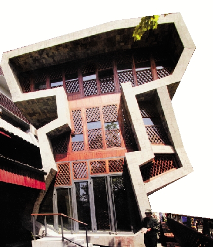 ←王澍的高台茶室就像一块被掏空的巨型太湖石。