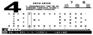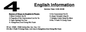 他说自己有几个外国朋友,每次坐公交车都会请中国朋友写下中英文的站名以校对。这并不是一件容易的事。他用PPT做了两块站牌,叫English Information(英文信息)。以4路为例。4路一共有16个停靠站,他选取了其中的8个站点作翻译。“这是我所认为的比较重要的站,我在它们下面标注了数字,英语翻译和数字对应。”比如,九溪下方是1,对应的1就是Nine Creeks。除了英文还有拼音站名。