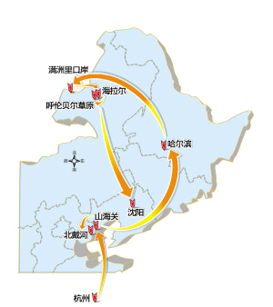 7月31日,从杭州出发,你可以一路北上,先后抵达北戴河、山海关、哈尔滨、满洲里口岸、海拉尔、呼伦贝尔草原、沈阳,最后从沈阳返回杭州。整个旅程历时11天,其中有6个晚上住在火车上,其余住在当地旅馆。具体行程为——