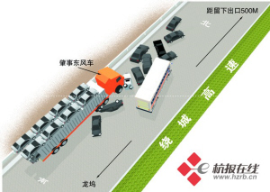 东风半挂车从南向北(龙坞往留下方向)行驶,行驶到距离留下出口不到500米处,东风追尾撞了前面的货车和轿车,引发了12车连环撞。出事后,路面车道几乎瘫痪。