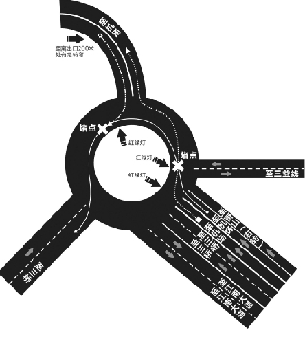 另外,在经过多个红绿灯后,会造成转盘机场快速路出口和三桥上桥口中间路段大量车辆打结,容易出现车辆刮擦事故,一旦出现事故,又将整体影响转盘的“转速”。