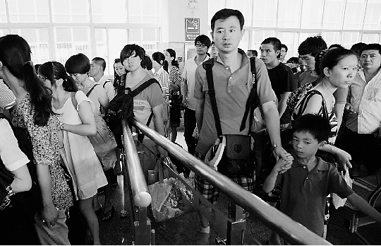 候车室椅子已经完全不够用了,两排椅子中间的过道上都站满了人,还有些人干脆铺张报纸,直接坐在地上,有点像春运时的气氛。