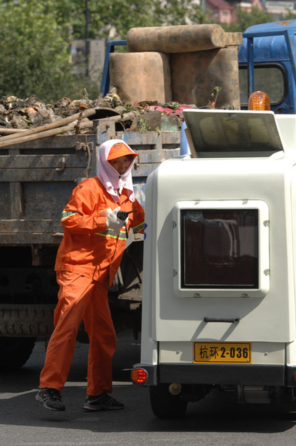 7月24日,苟述荣在处理垃圾车上撒落下来的垃圾。