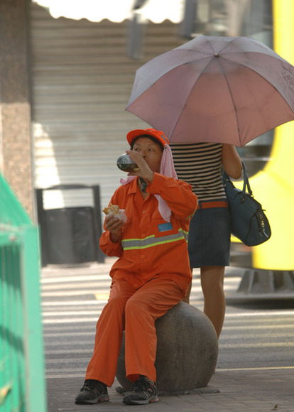 7月24日上午,苟述荣坐在立交桥下面吃早饭。