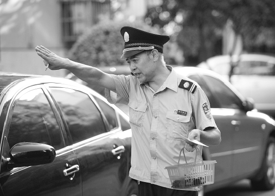 记者来到武林花园,在南大门的通道附近一眼就认出了陈能井,烫出裤线的保安制服,笔挺的腰,走起路来脚下带风,最标志性的是手提一只塑料篮子,里面装了半篮子的汽车钥匙。他和另一位保安小余搭档,小区转一圈,看好哪里有空出来的车位,然后找到停在通道最外层的一辆车,找出钥匙,小余去倒车,老陈就跟在车后面,一边打手势一边喊:“左面偏一点,往后,方向盘再打得大一些……”