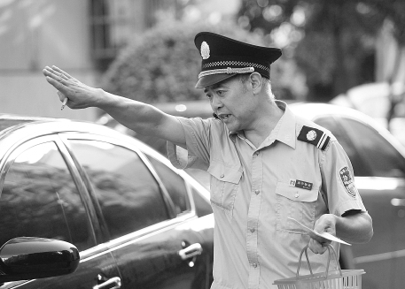 这个时候他的保安服已经湿了。开始时,记者还能跟着他一起随车跑跑,15分钟后,停好第五辆车,记者实在跑不动了,只能蹲在树阴下喝水喘大气,老陈衣服几乎湿透,依然跟着车,跑得很快。我问老陈:“你每天早晨跑多少路?”他想了想:“不好说。车多点,相当于跑个5公里急行军。”